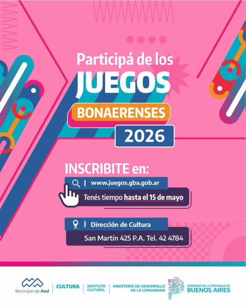 El Municipio de Azul informa que se encuentra abierta la inscripción para participar en la edición 2026 de los Juegos Bonaerenses, en el área Cultura, la cual se extenderá hasta el 15 de mayo.