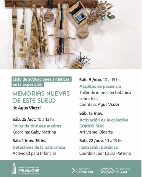 El Municipio de Azul invita a la comunidad a participar de la primera actividad del ciclo de encuentros que se inaugurará este sábado 25 en el Centro de Interpretación Salamone, en el marco de la exposición “Memorias nuevas de este suelo” de Agustina Viazzi.
