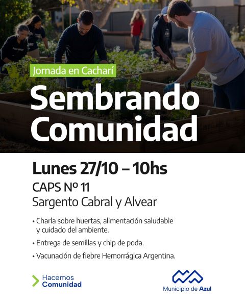 El Municipio de Azul informa que el lunes 27 a las 10, se desarrollará una jornada del programa “Sembrando Comunidad” en Cacharí.