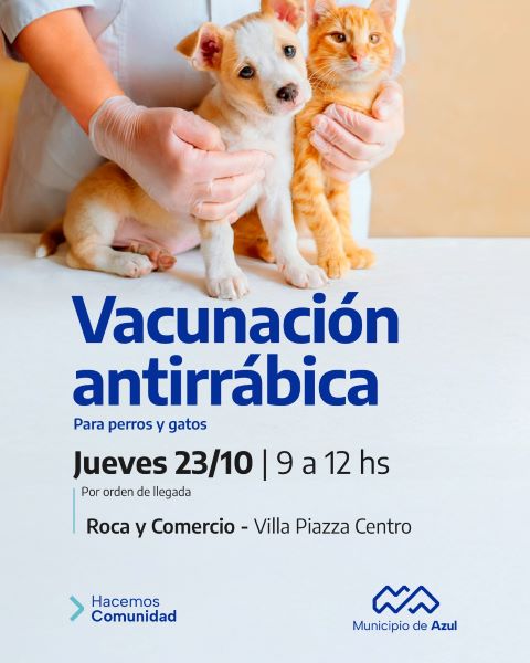 El Municipio de azul informa que este jueves 23 tendrá lugar una nueva jornada de vacunación antirrábica gratuita para perros y gatos en el barrio Villa Piazza Centro.