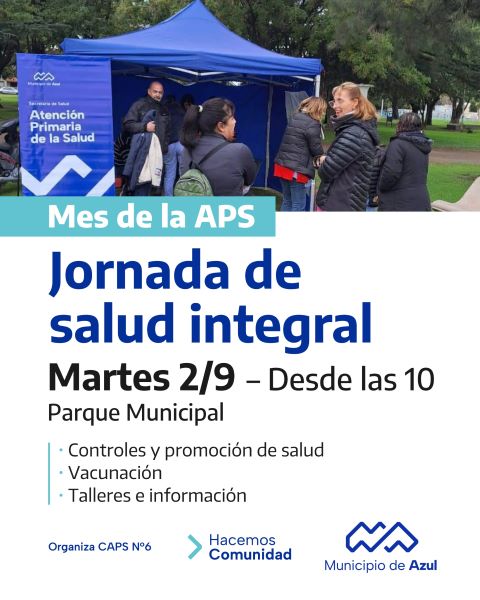 El Municipio de Azul invita a la comunidad a participar HOY martes de la jornada de salud integral organizada en el marco del Mes de la Atención Primaria de la Salud, que se conmemora cada 12 de septiembre y que en Azul significa el 33° aniversario de la creación del servicio.