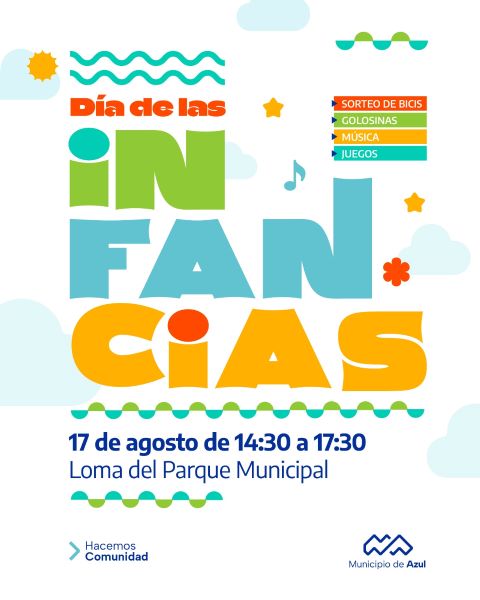 El Municipio de Azul recuerda a la comunidad que este domingo 17 se festejará el Día de las Infancias, de 14:30 a 17:30, en la Loma del Parque Municipal.