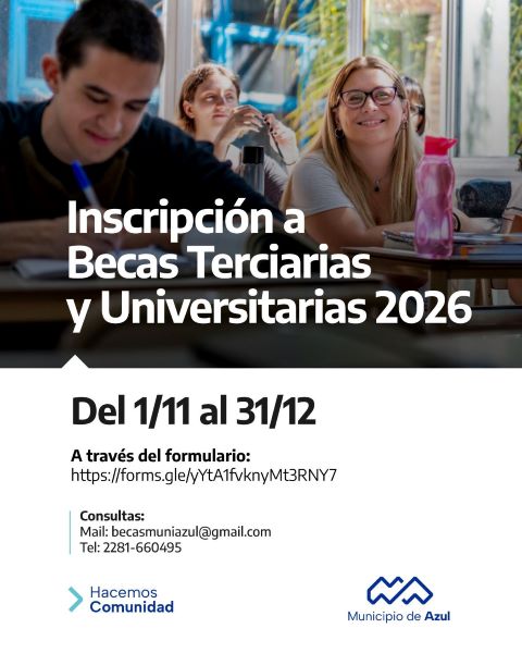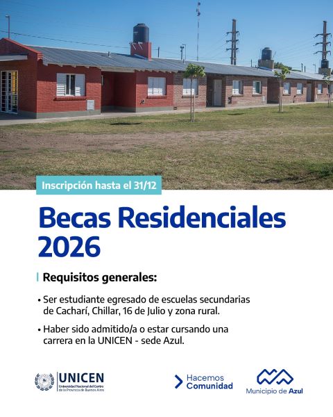 El Municipio de Azul informa que se encuentra abierta la convocatoria para las Becas Residenciales 2026, destinadas a estudiantes de las localidades que conforman el partido de Azul que deseen continuar sus estudios universitarios en la Universidad Nacional del Centro de la Provincia de Buenos Aires.