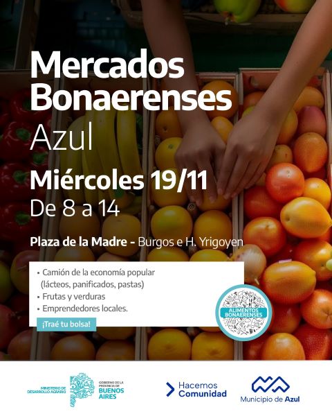 El Municipio de Azul informa que el miércoles 19, de 8 a 14 aproximadamente, se realizará en la Plaza de la Madre (Burgos e H. Yrigoyen) una nueva edición del programa provincial Mercados Bonaerenses.