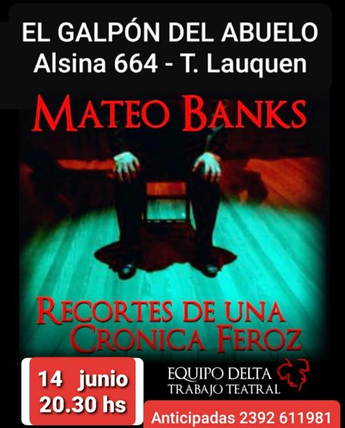 El Equipo Delta de Azul presenta la obra teatral "Mateo Banks, Recortes de una crónica feroz". Surgida del Concurso del CPTI (Consejo Provincial de Teatro Independiente) sobre "El teatro y la historia regional" cuenta con dramaturgia de Edelmiro Menchaca Bernárdez. El trabajo escénico no sólo se ha convertido en un fenómeno escénico azuleño sino qu