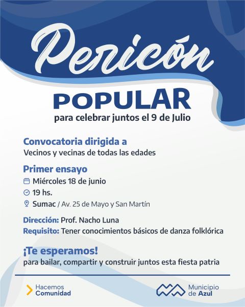 El Municipio de Azul invita a vecinos y vecinas de todas las edades a sumarse al Pericón Popular que se bailará durante el acto oficial del 9 de Julio para celebrar nuestras raíces y fortalecer el encuentro comunitario.