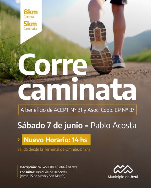 El Municipio de Azul informa que –a pedido de varios deportistas que desean participar- se modificó el horario de la correcaminata solidaria a beneficio de la Asociación del Centro Educativo para la Producción Total (ACEPT) Nº 31 y la Asociación Cooperadora de la Escuela Primaria N°37.