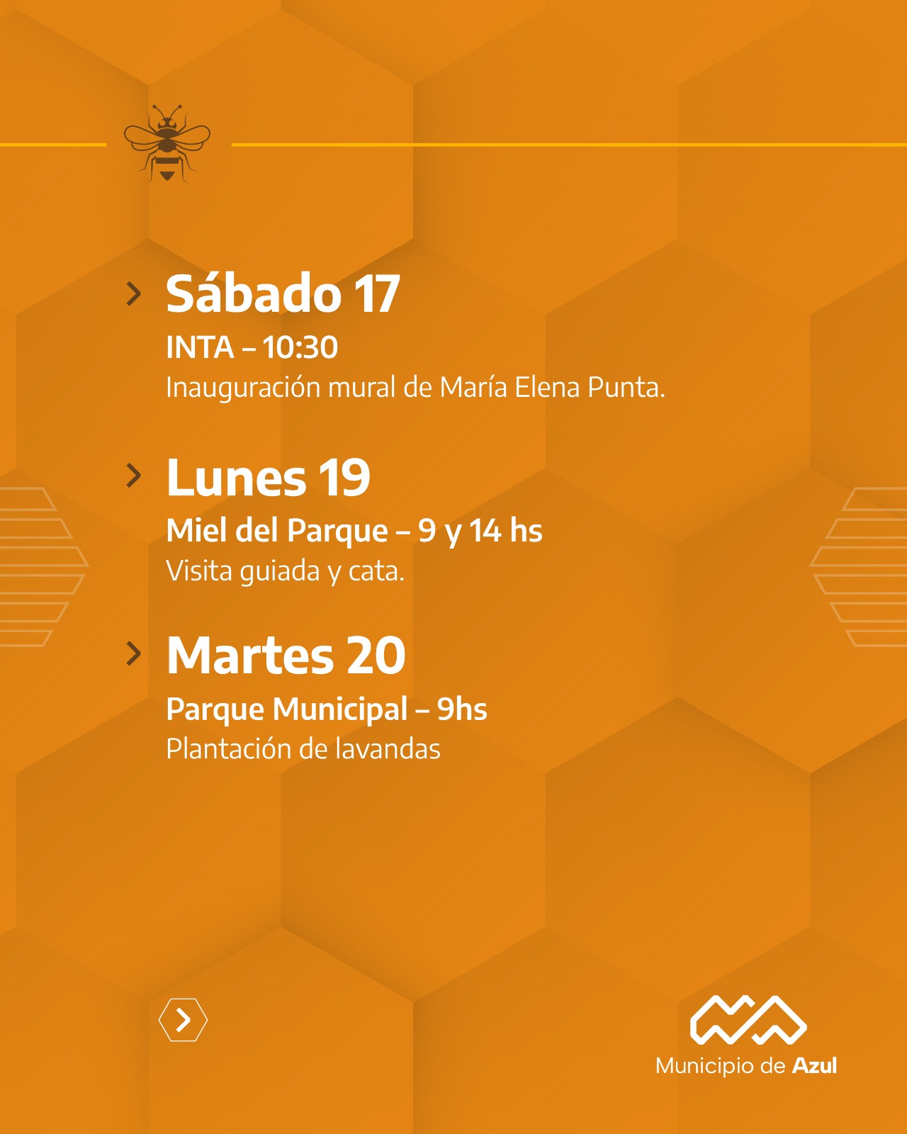 Lunes 19: De 9 a 11 y de 14 a 16, se realizará una visita guiada y una cata de miel en la empresa “Miel del Parque”. La inscripción es gratuita y se saldrá desde la sede del INTA.