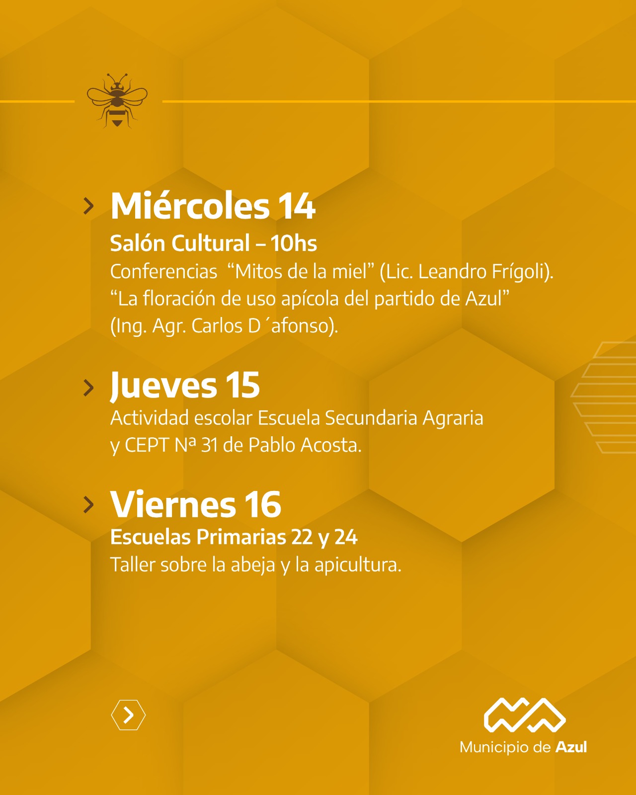 Posteriormente, se brindarán las conferencias educativas “Los mitos de la miel" (Lic. Leandro Frígoli – INTA – ProApi) y “la Floración de uso apícola del partido de Azul” (Ing. Carlos D´afonso). Las mismas están destinadas a estudiantes del primer ciclo de escuelas de nivel secundario de Azul.